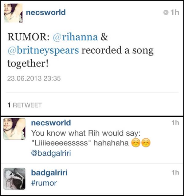 Eu ouvi a música na voz de Rihanna e disseram-me que a música seria enviada para a equipa de Britney na terça-feira, e que possivelmente estaria (a música) no comercial de Rouge by Rihanna (novo perfume). (...)"