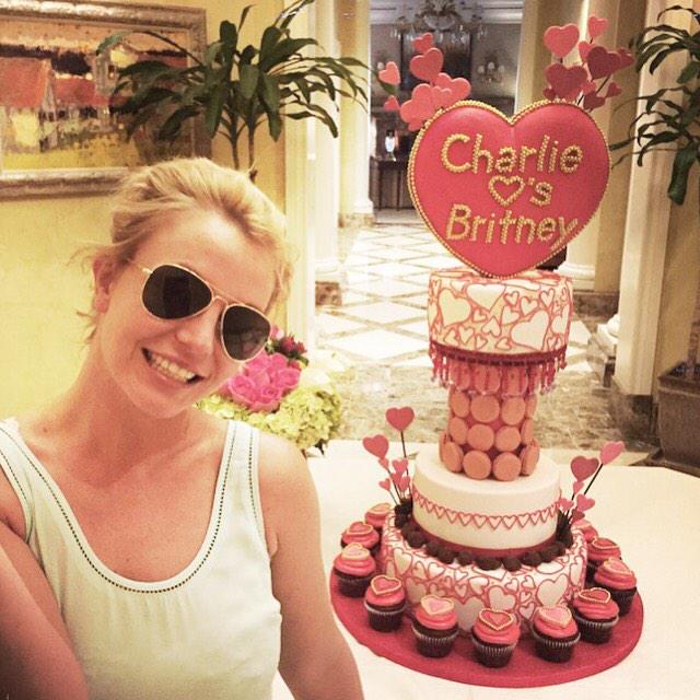 A "guerra dos bolos" entre Britney e Charlie acabou! Brit-Brit mostrou nas redes sociais o gigante e fantástico bolo que Charlie ofereceu a Britney no Dia de São Valentim.